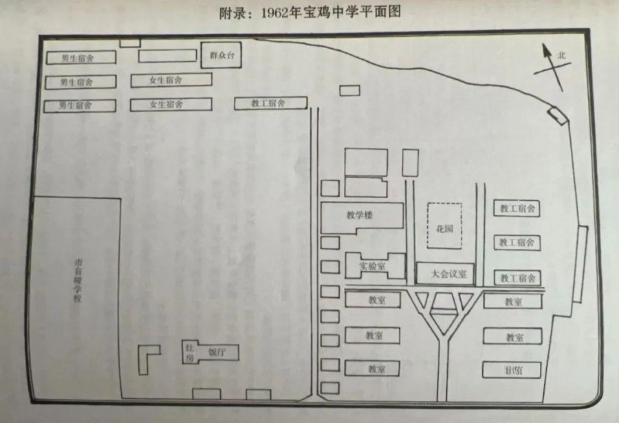 (一)东风化雨,春暖教苑 上个世纪60年代初,刚刚走出三年困难时期。市区西关外那一片热土,生机盎然。 在那个百业复苏的重要历史时期,母校展开热情双臂,迎来了六一届、六二届、六三届小学和初中毕业生进校。 造化弄人,这一批青涩少年,数年间“经风雨,见世面”,居然淬炼成为举世闻名的“老三届”人。 当年的宝鸡中学,背依陵塬,南望渭河。东起新维巷,西抵高家坪,校园北部还圈有一片郁郁葱葱的山坡林地。最盛之时,占地达150多亩。 从塬顶俯瞰,正对西关什字,老校门内高大照壁背后,一条南北走向笔直的林荫道,将学校化分成东、西两大园区。
